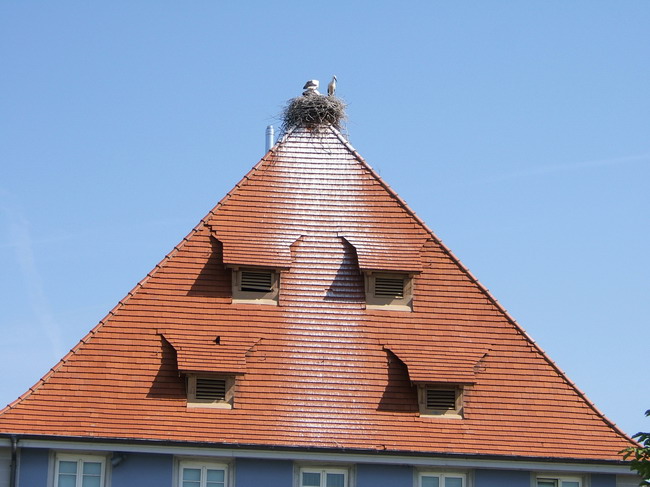 der Kunststorch verhindert ein Abrutschen am Giebel, die Gefahr für