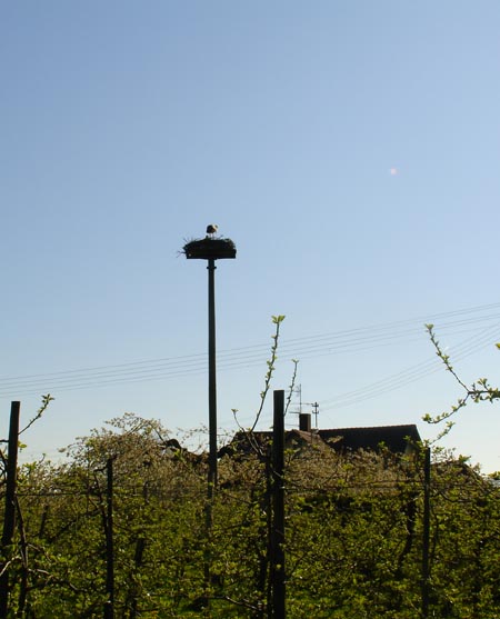 2010: Am 28.04.2010 haben im jeweiligen Abstand von 2 Tagen hier vier Jungstörche das Licht der Welt erblickt und sind alle wohlauf. 2008: In diesem Jahr wurden vier Jungstörche beringt. 2007: Das 2006 hier erfolglos brütende Weibchen hat dieses Jahr einen neuen Partner aus der Schweiz. 2006: Brutverlust. 2005: Nach vier Jahren ist dieser Pfahlhorst erstmals