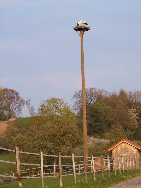 Badener. Juni: Tatsächlich wurde um den 20. April im Spöcker Nest mit der Brut begonnen und 32 Tage später pellten sich die ersten Küken aus dem Ei. Obwohl die Spöcker recht spät dran waren, und bei späten Bruten normalerweise weniger Eier gelegt werden, bekamen die Spöcker Störche tatsächlich noch vier Junge. Doch waren diesen nur wenige Tage gegönnt, und diese Tage bestanden vor allem aus Frieren und Hungern, denn es regnete ohne Unterlass. Schon nach kurzer Zeit lagen alle vier tot unterm Nest. Kein guter Anfang für unser junges Brutpaar. Ob sie es nächstes Jahr nochmal in Spöck versuchen werden? 2012: Es haben zwar noch nicht alle umherziehenden Weißstörche einen Platz gefunden, aber bisher sieht es so aus, als ob das Nest in Spöck dieses Jahr leer bleiben wird. Das letztjährige Spöcker Brutpaar ist nämlich nach Denkingen umgezogen. Aber wie gesagt, noch besteht Hoffnung, denn die Horstbelegungen sind noch nicht abgeschlossen. Mitte Juni: Nichts Neues aus Spöck. 2011: Schon vor fünf Jahren wollten sich einmal